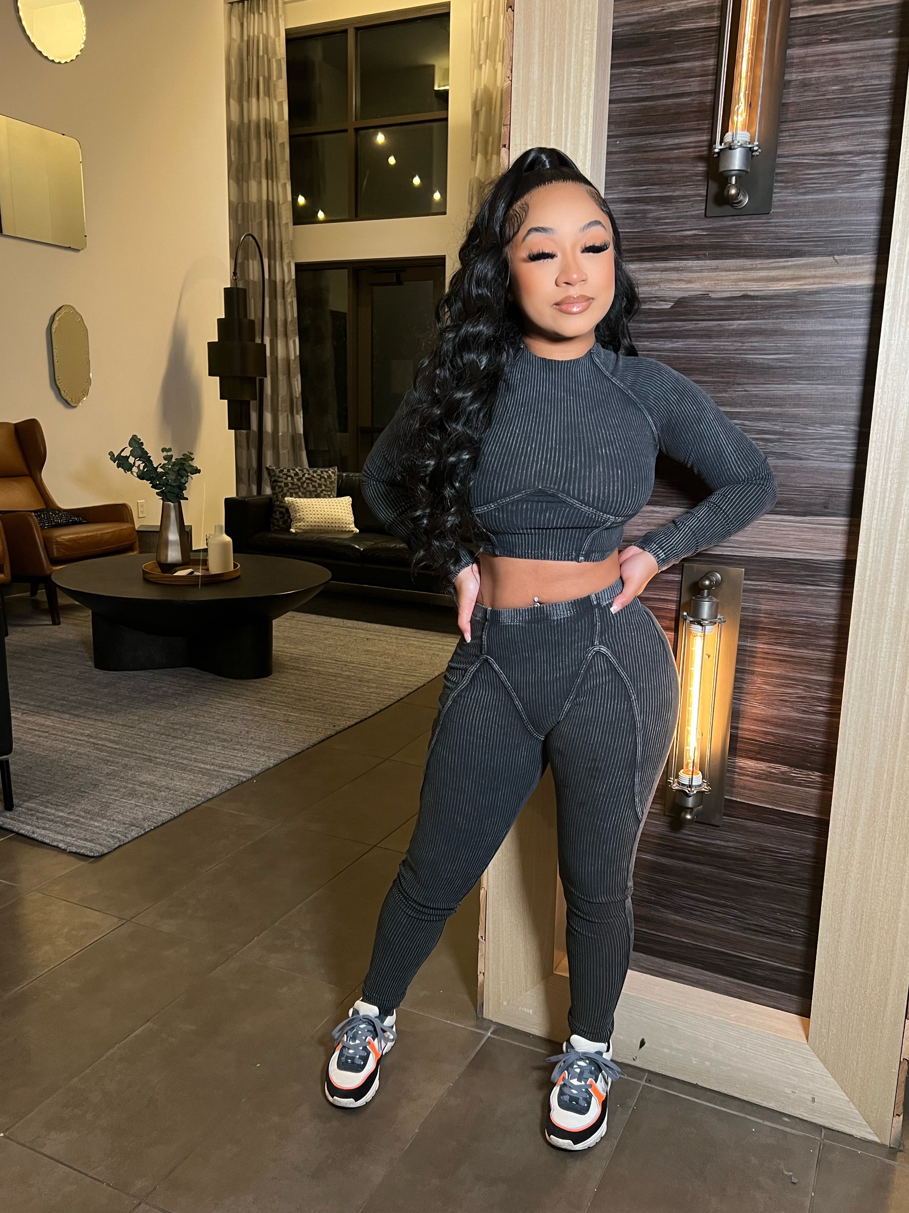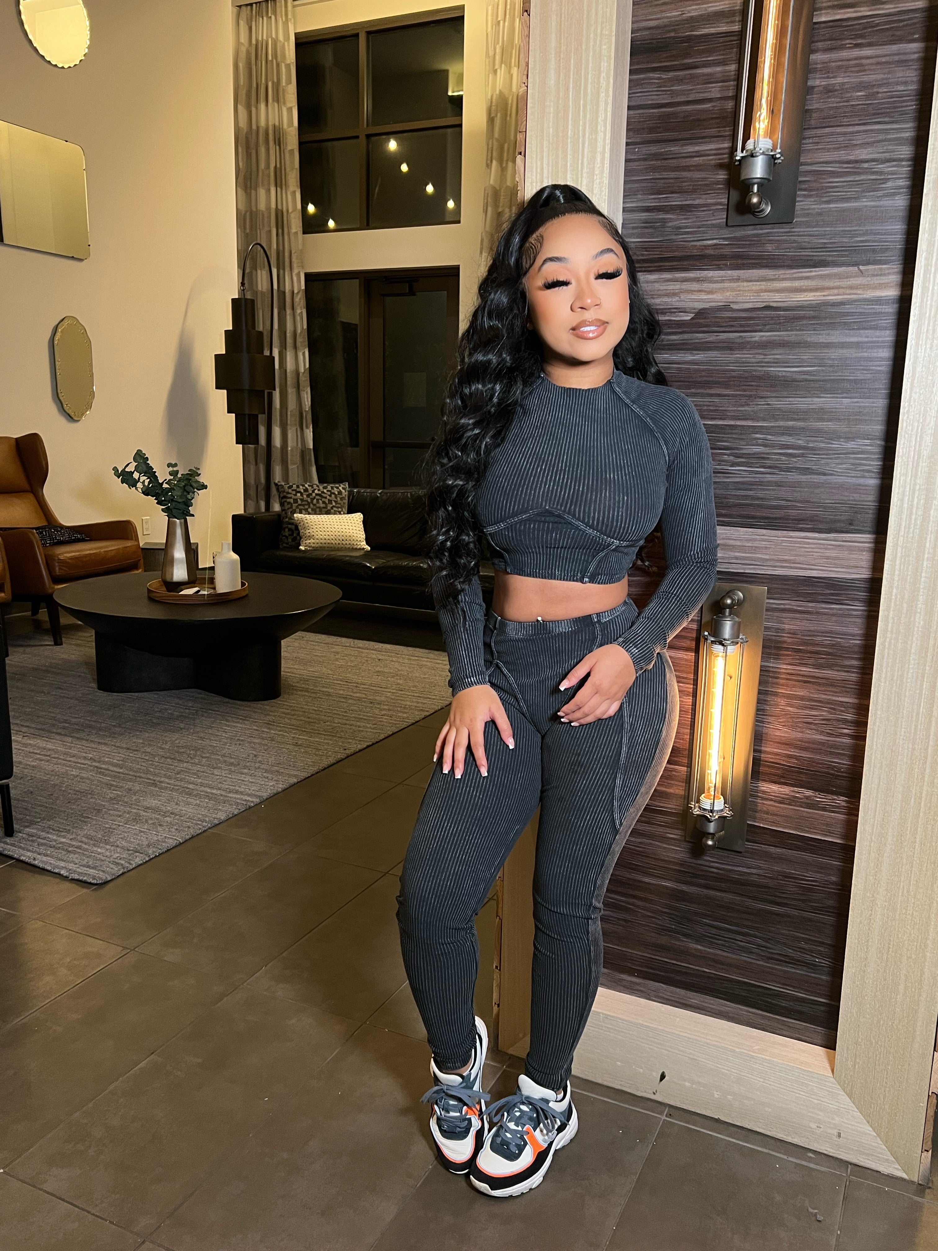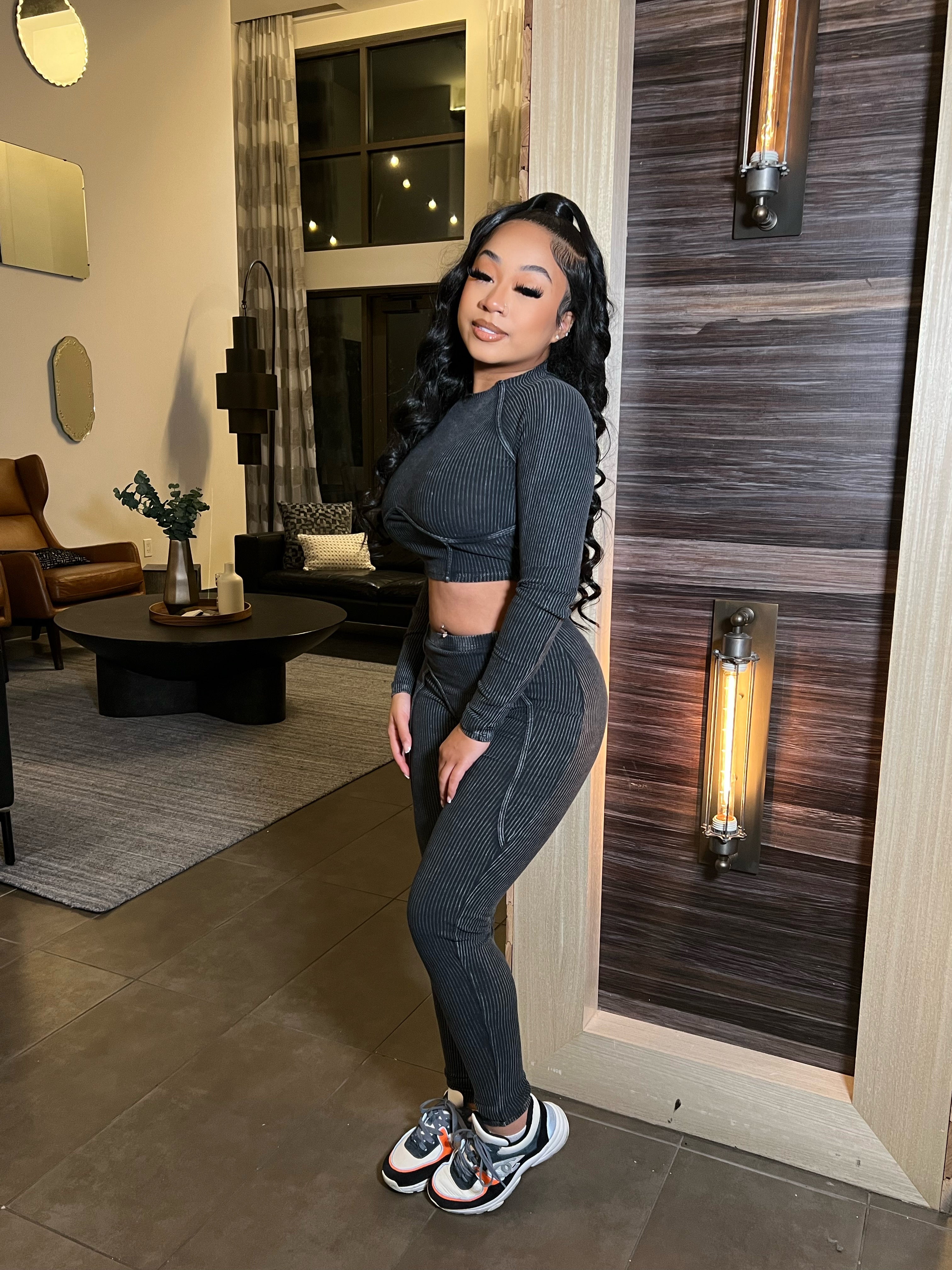 Mineral wash, ribbed 2 piece set. Model is wearing a size small.