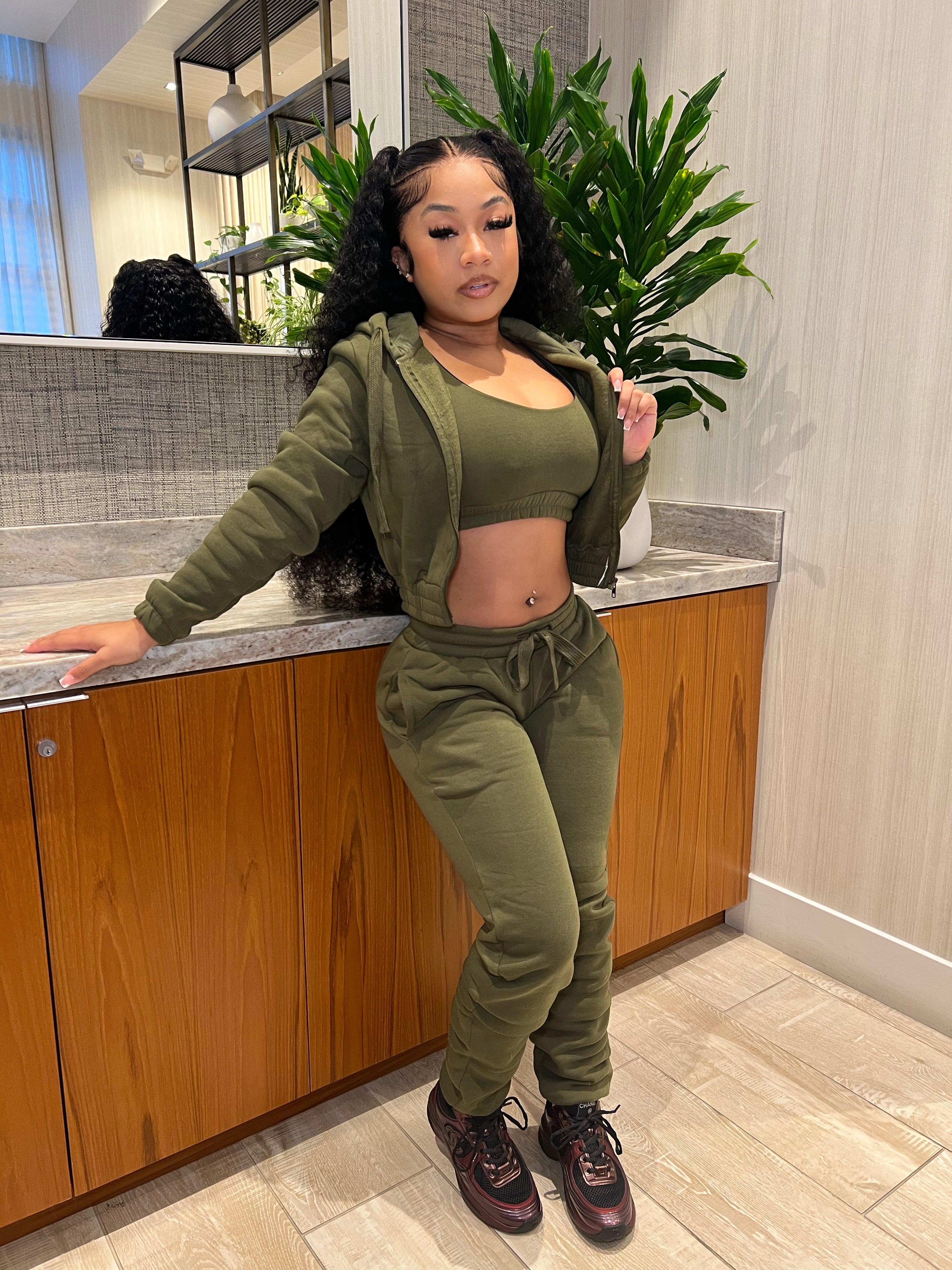 3 piece jogger set. Model wearing a size small but can fit medium as well.