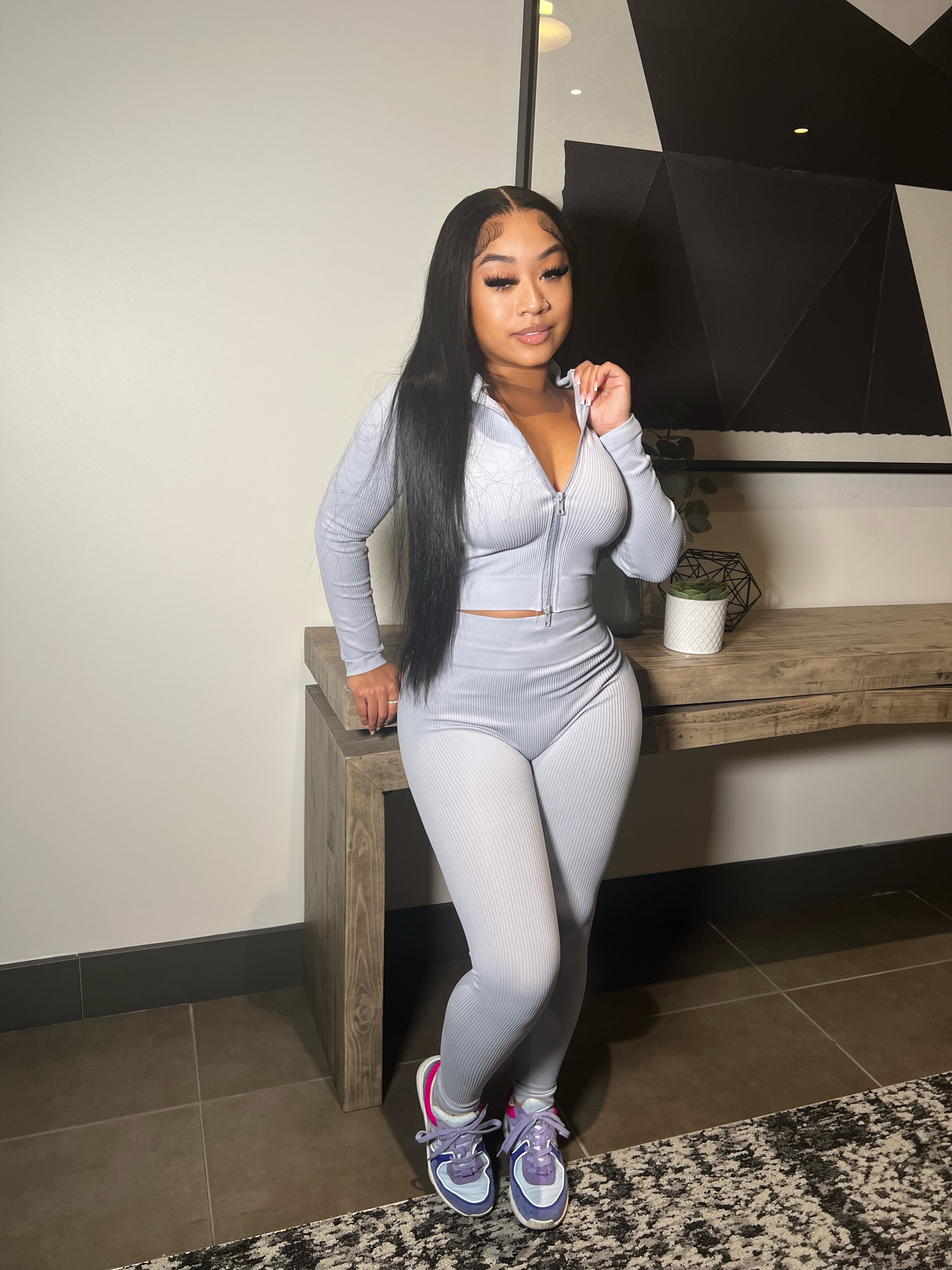 Ribbed, hooded cropped jacket with matching leggings. Has stretch, model wearing a size S/M.